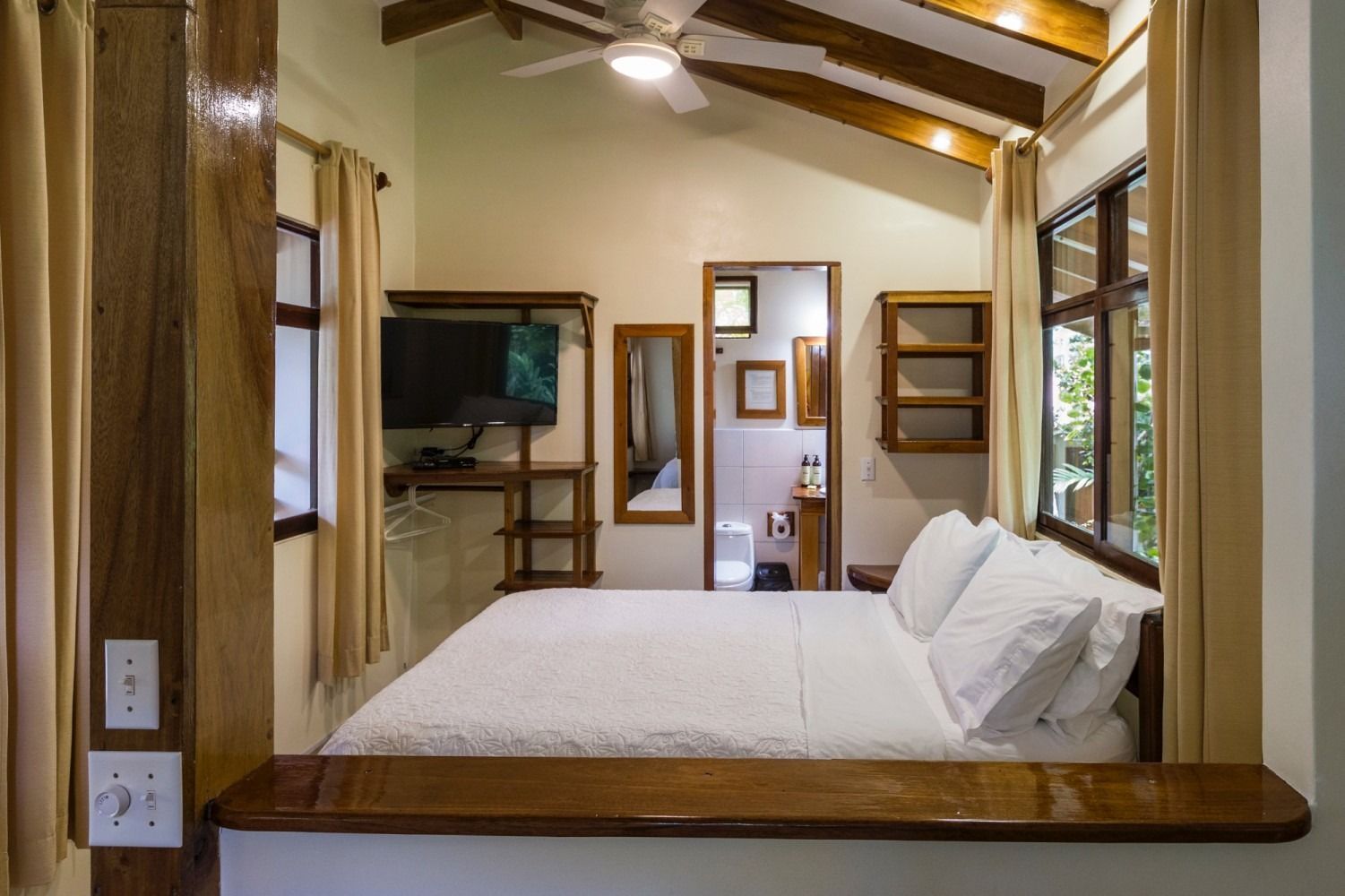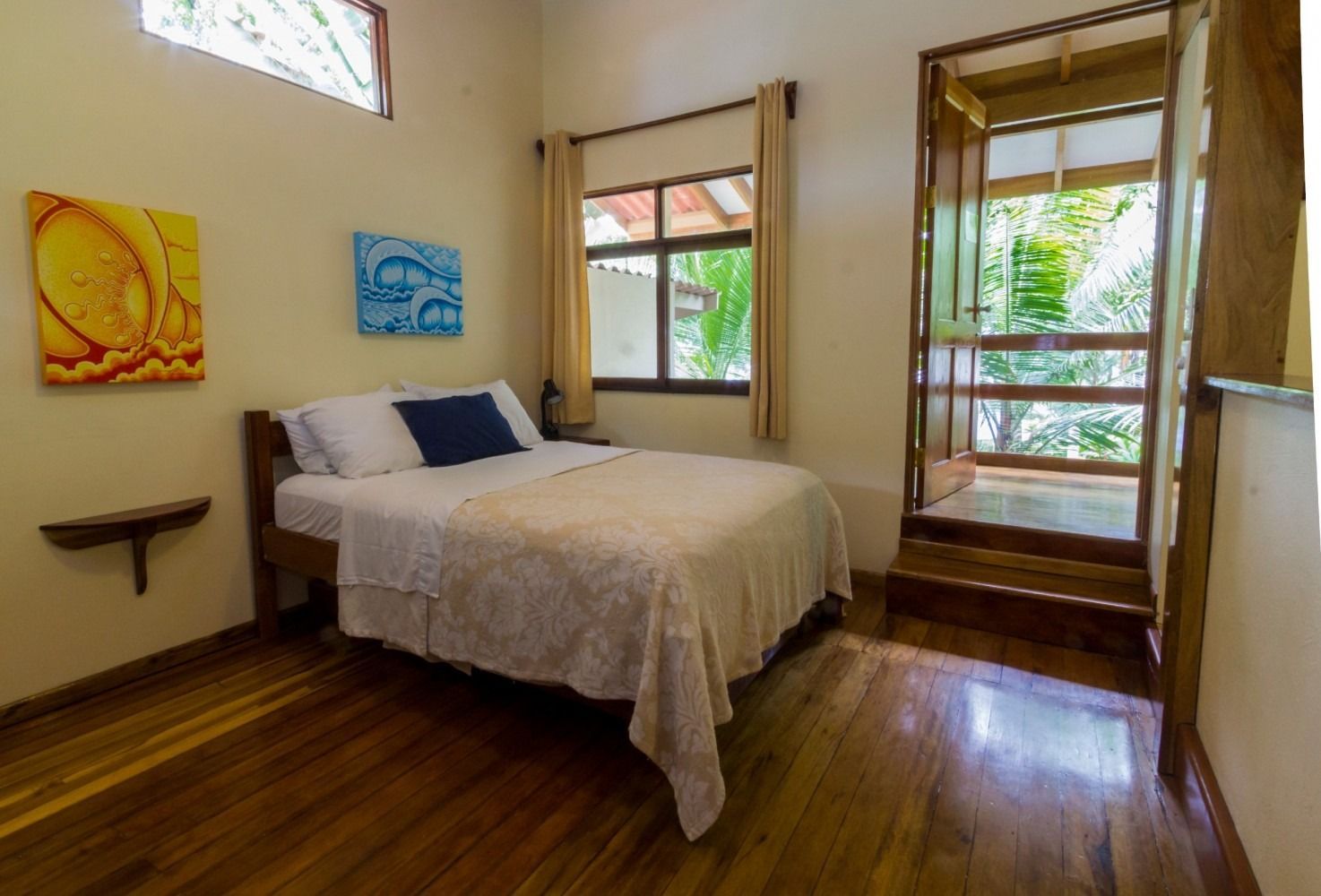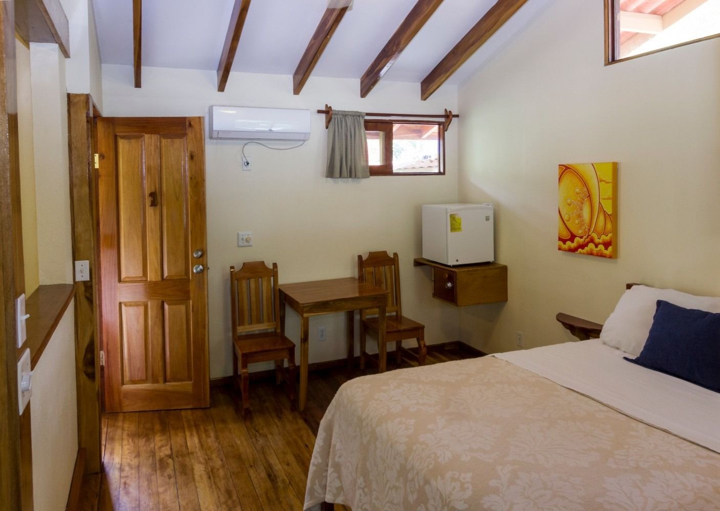 Second-floor poolside room with our best ocean view balcony. Features a large screened balcony with table and chairs, several windows for great breeze, and an en-suite bathroom. Includes air conditioning, fans, refrigerator, and TV with satellite channels. Has stairs. Ideal for any 1–4 guests.
