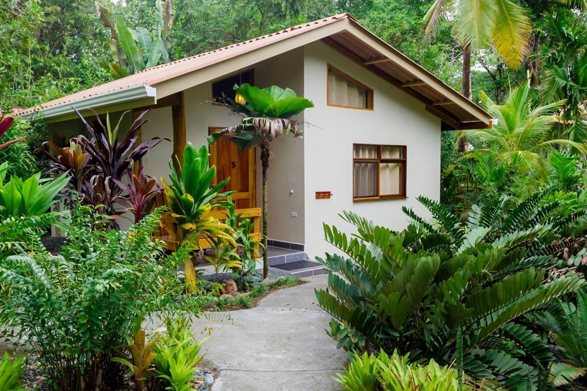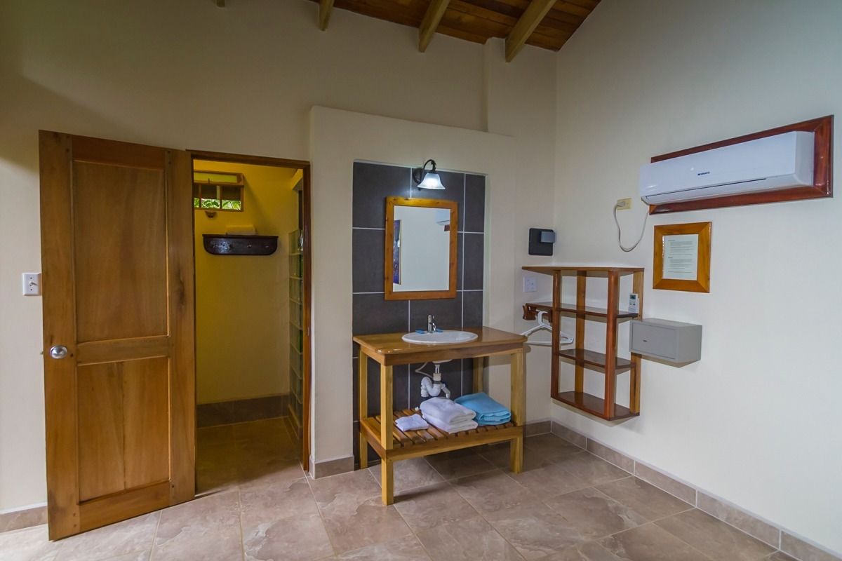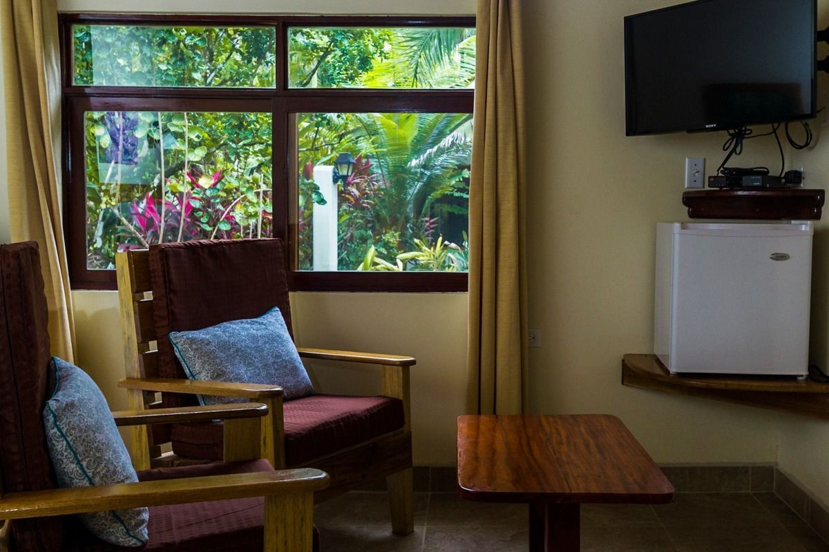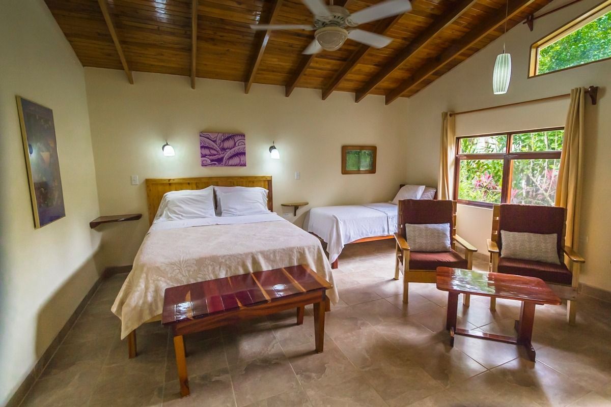 Cozy room in a lovely garden setting on the ground floor. Offers a patio, sitting area, en-suite bathroom, fan, air conditioning, refrigerator, and a TV with satellite channels. No stairs. Private and peaceful. Ideal for couples, small families, or any 1–3 guests.