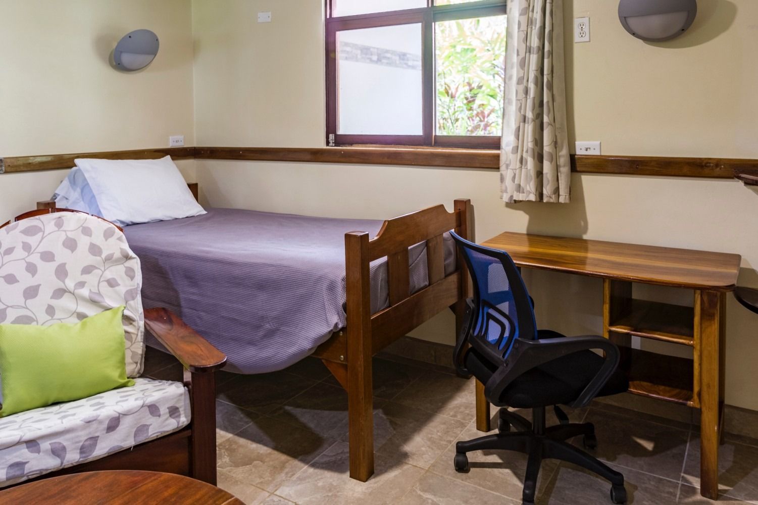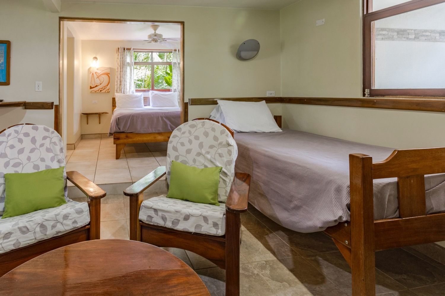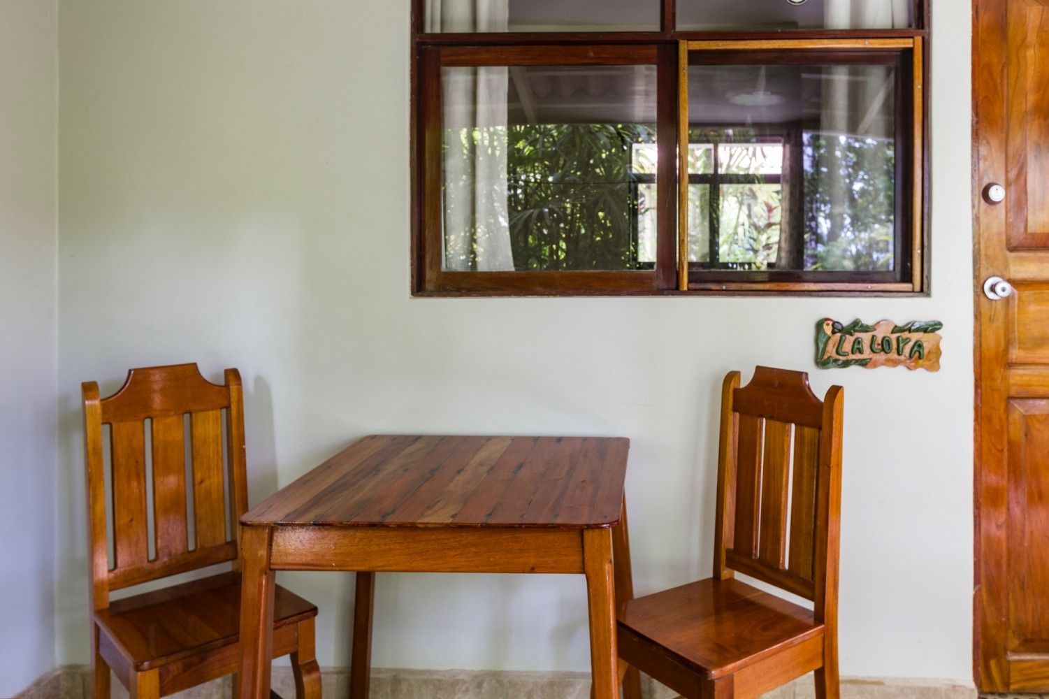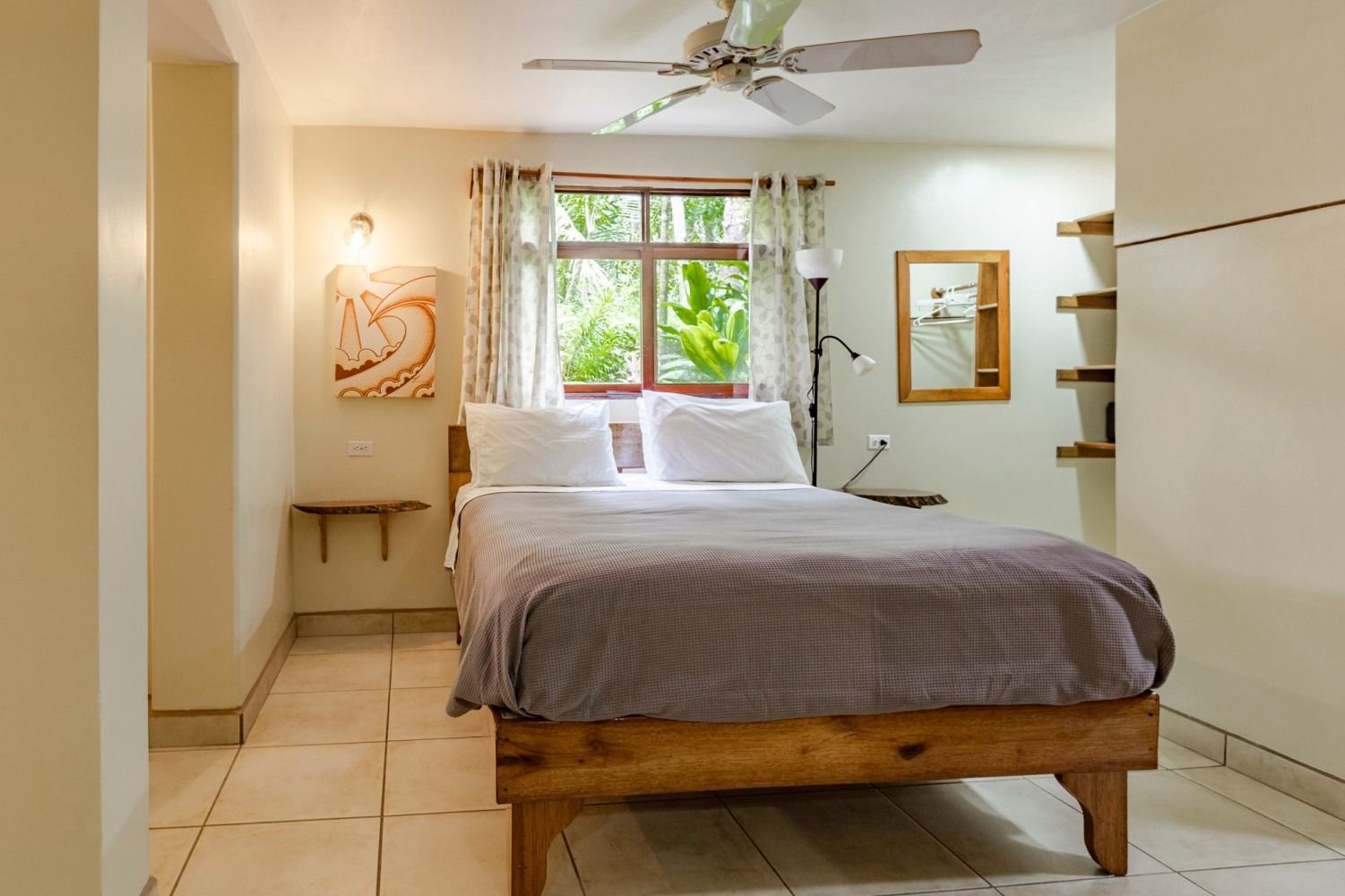 Spacious ground-floor room with a tranquil garden view. Features a furnished patio, sitting area, and convenient access to both parking and the beach. Includes an en-suite bathroom, air conditioning, fans, refrigerator, small desk with office chair, and a TV with satellite channels. No stairs. Located below La Lapa (same building). Great for couples, a group of 2–4 friends, or families with young children.