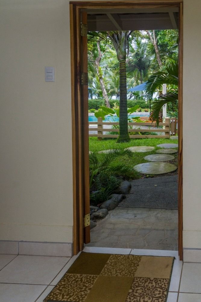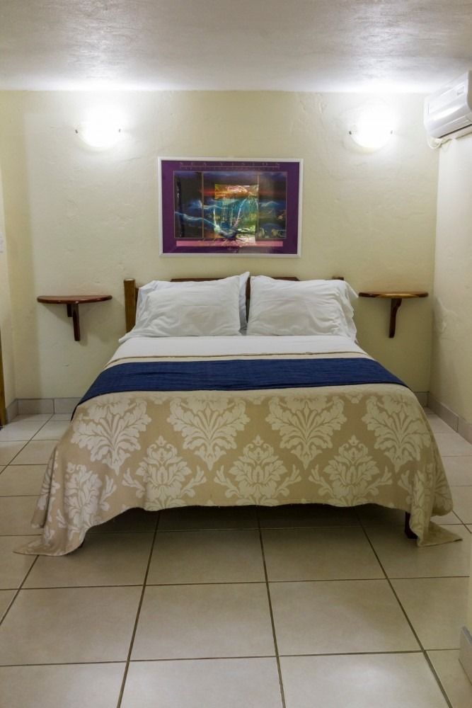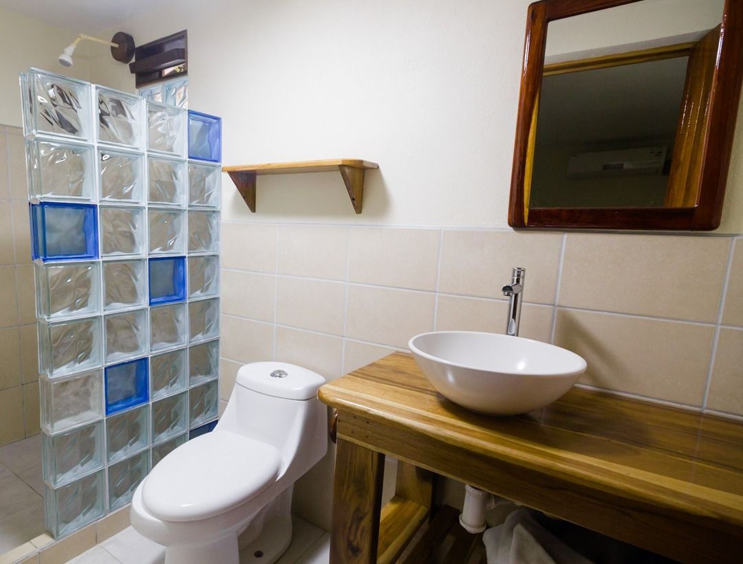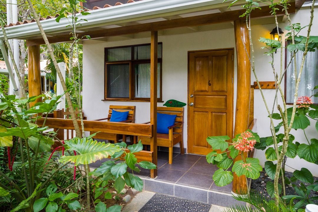 Small, ground-floor room with a serene jungle-lined ocean view. Located poolside and featuring a furnished patio with table and chairs. Includes an en-suite bathroom, air conditioning, fan, refrigerator, and a TV with satellite channels. No stairs. Conveniently situated next door to La Palma and just below El Tucan. Great for solo travelers, two friends, or couples.